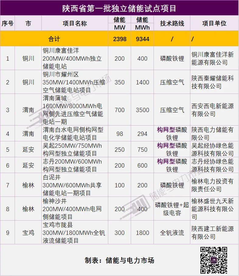 儲(chǔ)能與電力市場(chǎng)獲悉,12月30日,陜西發(fā)改委發(fā)布關(guān)于陜西省第一批獨(dú)立儲(chǔ)能試點(diǎn)項(xiàng)目遴選結(jié)果的公示,共9個(gè)項(xiàng)目,規(guī)模合計(jì)2.398GW/9.344GWh。技術(shù)類型包含磷酸鐵鋰(構(gòu)網(wǎng)型&跟網(wǎng)型)、壓縮空氣、全釩液流、磷酸鐵鋰+超級(jí)電容混合儲(chǔ)能。